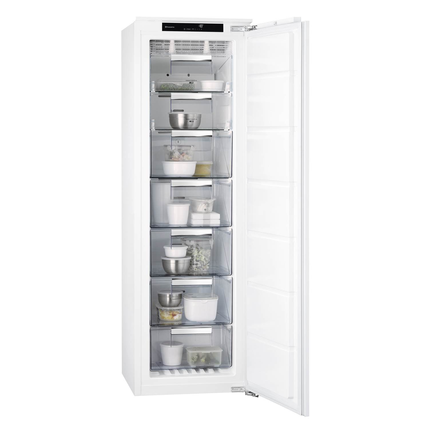 Frysen QT600I från Husqvarna är designad för inbyggnad och har en rad smarta funktioner för att säkerställa att din mat förvaras på bästa möjliga sätt. För att integrera frysen i köket på ett sömlöst sätt, krävs en egen snickerilucka som inte ingår i leveransen. Monteringen av snickeriluckan sker med Door on door-teknik, vilket möjliggör enkel och snygg integration med övriga köksskåp.